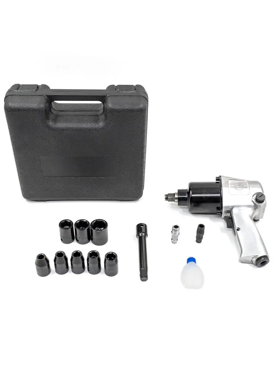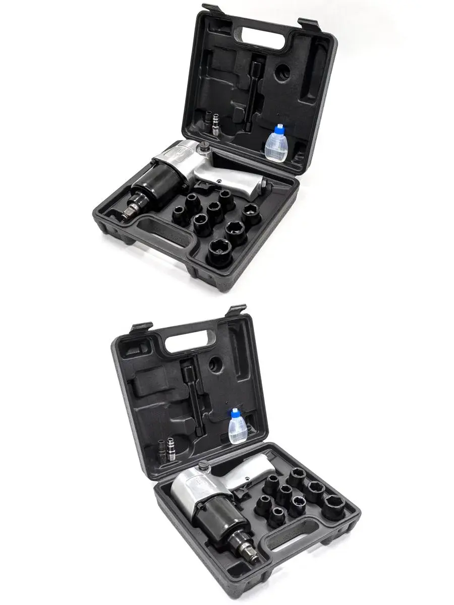 В комплект входит прочный кейс и набор ударных головок, что делает инструмент полностью готовым к использованию. Такой комплект используют для обслуживания автомобилей, грузовой техники, ремонта подвески, тормозных механизмов, а также для сезонной замены колёс.