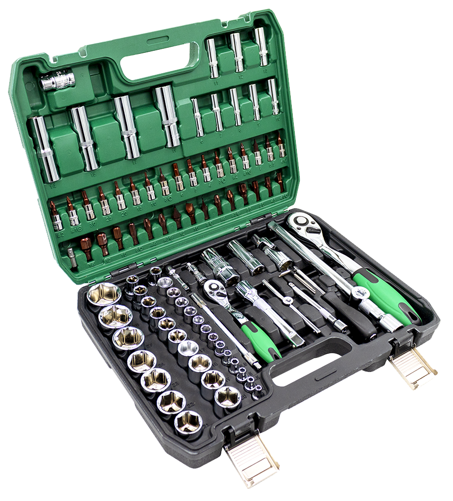 - Головки торцевые ½" (18 шт.): 10, 11, 12, 13, 14, 15, 16, 17, 18, 19, 20, 21, 22, 23, 24, 27, 30, 32 мм;